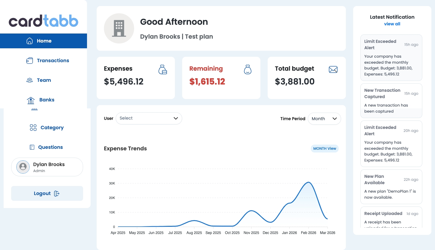 CardTabb is not only a receipt app. The web platform gives admins and managers a central place to review company spend, inspect operational trends, manage people and categories, answer support activity, and control the policy environment behind every transaction.
